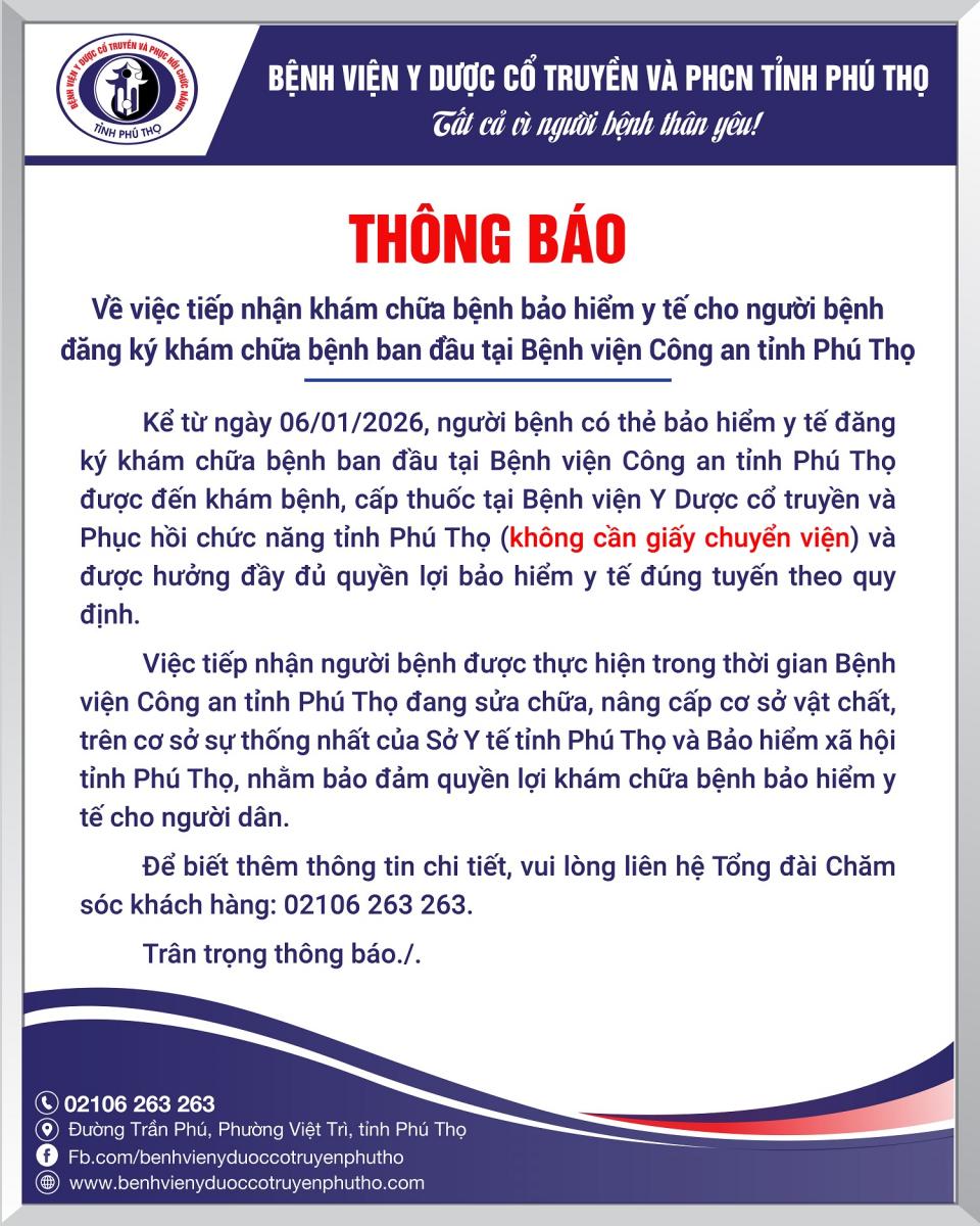 Kể từ ngày 06/01/2026, người bệnh có thẻ bảo hiểm y tế đăng ký khám chữa bệnh ban đầu tại Bệnh viện Công an tỉnh Phú Thọ được đến khám bệnh, cấp thuốc tại Bệnh viện Y Dược cổ truyền và Phục hồi chức năng tỉnh Phú Thọ (không cần giấy chuyển viện) và được hưởng đầy đủ quyền lợi bảo hiểm y tế đúng tuyến theo quy định.